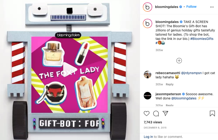 2015 年,Bloomingdale's 提出了一種創新方法,將 100 種產品放入一個簡短的交互式視頻中。 這家零售品牌迅速在其動畫“GiftBot”機器內展示了一系列物品,邀請觀眾截取屏幕截圖,看看他們登陸的是哪個系列。 對於該活動,Bloomingdale's 總共製作了四個這樣的視頻——每個節日禮物指南一個。
