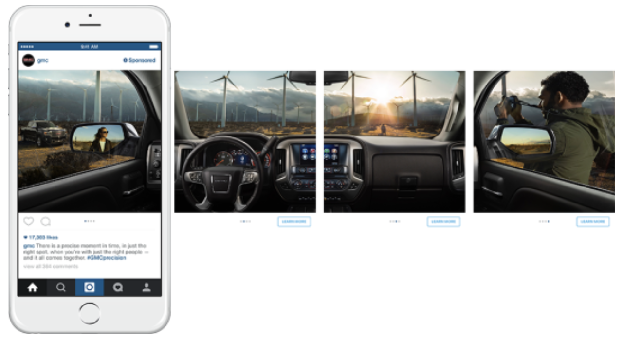 品牌可能會使用輪播廣告突出完成項目的步驟,展示一種產品的多種功能,甚至像 GMC 那樣將圖像連接成一個大全景圖。