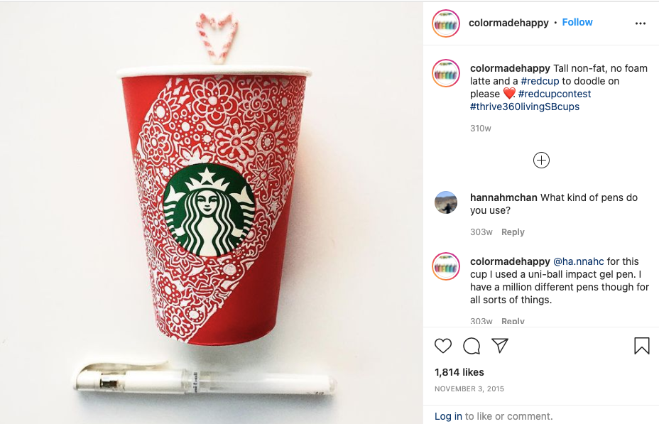 2015 年,星巴克舉辦了#RedCupContest。 為了參與其中,Instagram 用戶張貼了自己戴著標誌性紅色節日杯子的照片。 五位獲獎顧客每人收到一張價值 500 美元的星巴克禮品卡。