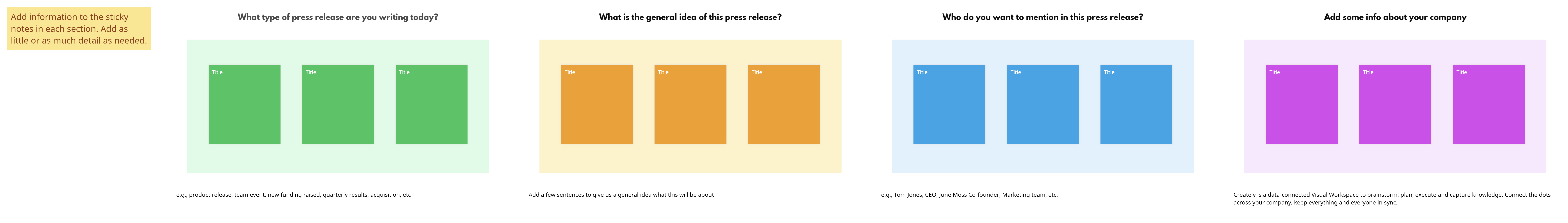 Creately 的新聞稿模板是公共關係專業人士有效規劃和構建新聞稿的便捷工具。 使用此模板,您可以與您的團隊協作並無縫合併重要內容。 以下是使用新聞稿模板的五個簡單步驟: