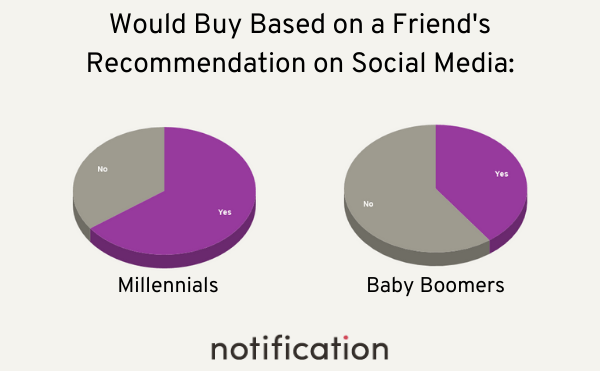 嬰兒潮一代傾向於通過評論做出決定,並希望從權威人物和/或行業領導者那裡獲得信息。 千禧一代似乎已經將購買之旅從此類研究轉移到社交媒體上更多來自朋友和影響者的隨意推薦。 65% 的千禧一代會購買朋友在社交媒體上推薦的產品,而嬰兒潮一代的這一比例僅為 40%。