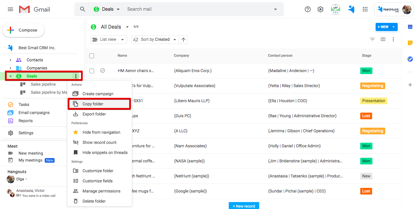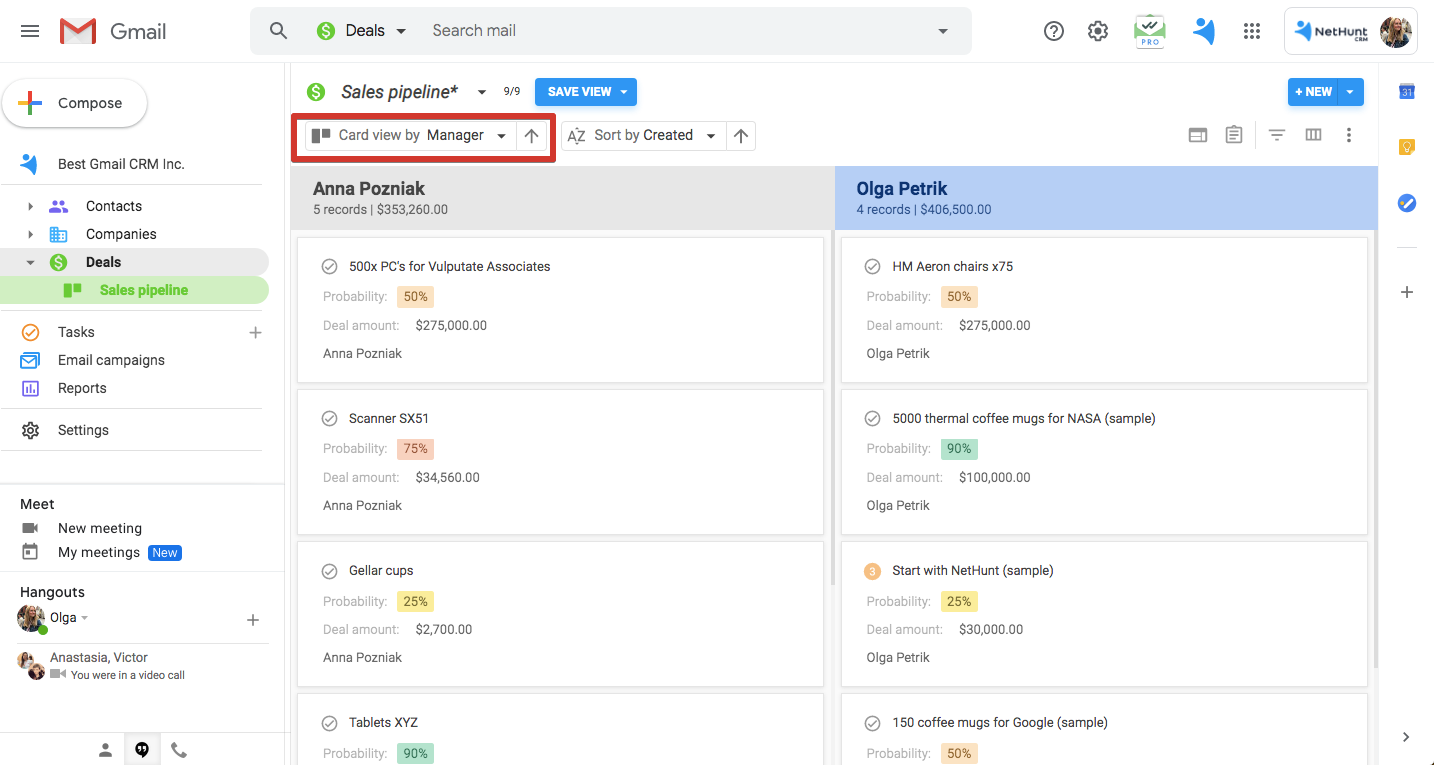 老實說,在 NetHunt CRM 中創建多個管道就像創建單個管道一樣簡單。 最棒的是,您可以在我們的系統中創建任意數量的管道! 為此,請前往“交易”文件夾並按“階段”對“卡片視圖”進行排序。