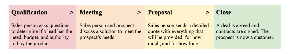 銷售管道是整個銷售過程的可視化快照。 通常可以在 CRM 儀表板中找到,但有時需要手動填寫,它們可以幫助銷售團隊掌握他們的銷售流程。 他們通過展示公司當前參與的每個潛在客戶在他們的買家旅程中的位置來做到這一點,幫助團隊了解他們需要做什麼才能完成交易。