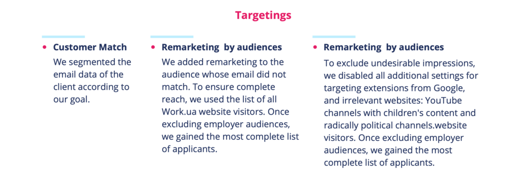 由於 Work.ua 資源涵蓋了已經形成和細分的廣泛受眾,因此我們決定首先確定現有的目標受眾,然後才開始尋找新的目標受眾。 為此,我們檢查了現有的再營銷列表並設置了投放所需的新列表。