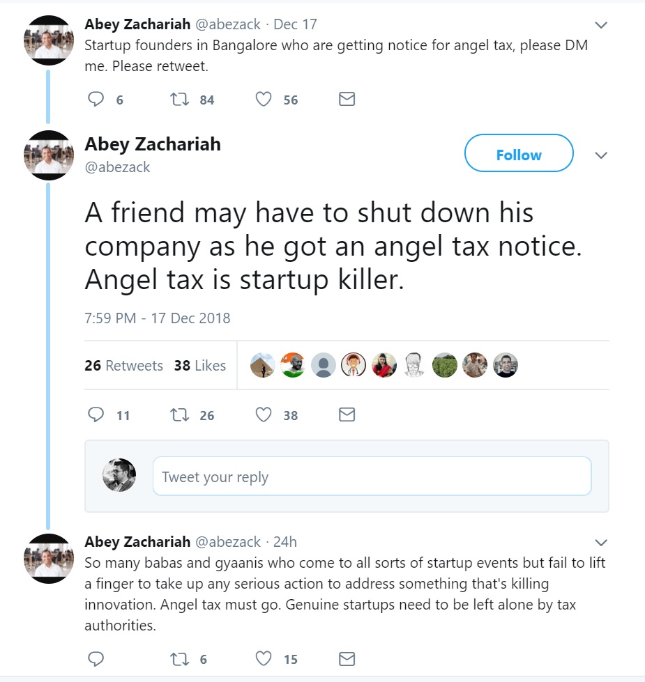 12 月 17 日,一位企業家兼 Goodbox 首席執行官 Abey Zachariah 在推特上寫道:“班加羅爾的初創公司創始人收到天使稅通知,請私信我。 一位朋友可能不得不關閉他的公司,因為他收到了天使稅務通知。 天使稅是創業殺手。”
