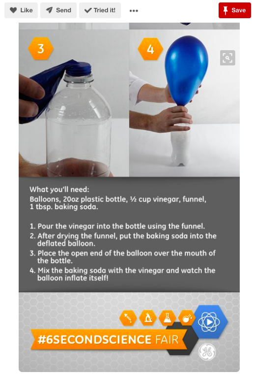 另外兩個值得注意的板包括“Badass Machines”,它展示了“GE 生產的最大和最糟糕的技術”,以及“DIY Science”。 後者用於推廣 GE 為 Vine 創建的多平台#6SecondScience Fair。 例如,這篇文章教人們如何使用醋、小蘇打和塑料瓶給氣球充氣。 它產生了超過 5.8K 的 Pin 圖。